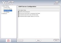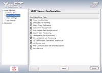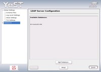 Az LDAP-szerver beállításához is használható a YaST. Az ilyen szerver nemcsak a felhasználói fiók adatait tudja kezelni, hanem egyéb adatokat is – például a levelezés, vagy akár a DNS- és DHCP-szerverek beállításait. A szerver beállítása erre a célra része a telepítési eljárásnak. A Hálózati szolgáltatások → LDAP-szerver menüpont segítségével indítsa el a megfelelő YaST modult.A megjelenő párbeszédablakban adja meg, hogy az LDAP-szervernek a rendszerindítás során el kell-e indulnia. A Beállítás elemre kattintva jut a tényleges konfigurációs párbeszédablakokba. Lásd: YaST OpenLDAP szerverkonfiguráció: Naplózási szint.