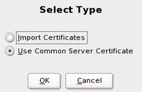 Először döntse el, hogy a szerver és kliens közötti adatforgalom használjon-e TLS- és SSL-titkosítást. Ezután nyomja meg a Tanúsítvány kiválasztása gombot egy tanúsítvány kiválasztásához. A megjelenő párbeszédablakban (YaST OpenLDAP-szerverkonfiguráció: Tanúsítvány kiválasztása) válassza ki a használni kívánt tanúsítvány típusát: A YaST automatikusan létrehozza a tanúsítványt a SUSE LINUX Enterprise Server telepítése során (Általános szervertanúsítvány használata), vagy az külső forrásból kerül importálásra (Tanúsítvány importálása). Ha a telepítés során nem készült általános szervertanúsítvány, akkor közvetlenül egy importálási párbeszédablakba jut.