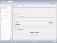 Az első párbeszédablakban jelölje meg, hogy az LDAP-t kívánja használni a felhasználók hitelesítéséhez. Adja meg a szerveren az LDAP alap DN mezőben a címtárfa azon objektumát, amely alatt az összes adat tárolásra kerül majd az LDAP-szerveren. Az LDAP-szerverek címe mezőben adja meg az LDAP-szerver(ek) elérési címét. A távoli gépeken a könyvtárak automatikus felcsatolásához jelölje meg az Az automounter aktiválása négyzetet. A szerver adatainak módosításához adminisztrátor felhasználóként kattintson a Szakértői beállítások gombra (YaST: Szakértői beállítások).