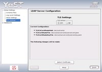 - A beállítás engedélyezi a hitelesítés nélküli (anonim) frissítési műveleteket. A hozzáférés az ACL-eknek és egyéb szabályoknak megfelelően van korlátozva (lásd: Globális utasítások az slapd.conf fájlban).Az engedélyezési (allow) jelzők módosítása után folytassa a TLS-beállítások megadásával, és határozza meg, hogyan kell biztonságossá tenni a szerver és a kliens közötti adatforgalmat. Lásd: YaST OpenLDAP-szerverkonfiguráció: TLS.