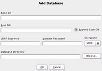 A YaST megjelenít egy párbeszédablakot a szükséges bejegyzések megadásához (YaST OpenLDAP-szerverkonfiguráció: Új adatbázis). Az Alap DN pontban adja meg az LDAP-szerver alap DN-jét. A Root DN pontban adja meg a szerverért felelős adminisztrátor DN-jét. Ha bejelöli az Alap DN hozzáfűzése lehetőséget, akkor csak az adminisztrátor cn-jét adja meg, a rendszer a többit automatikusan kitölti. Végül adja meg a szerveradminisztrátor jelszavát és válassza ki a jelszótitkosításhoz használandó algorimtust (crypt, smd5, ssha vagy sha). A beállítások megerősítéséhez és az előző párbeszédablakhoz visszatéréshez kattintson az OK gombra.