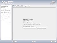 - A YaST háromféle telepítőszervert képes használni: HTTP-, FTP- és NFS-szervereket. Válassza ki a kívánt szervertípust. Mostantól a kívánt szerverszolgáltatás a rendszer indításakor automatikusan elindul. Ha a kiválasztott típusú szolgáltatás már fut a gépen, és kézzel kívánja beállítani, állítsa le a szerverszolgáltatás automatikus beállítását a Semmilyen hálózati szolgáltatást ne állítson be lehetőség kiválasztásával. Akárhogy is, meg kell adnia a könyvtárat, amelyben a telepítési adatok elérhetők lesznek a szerveren (YaST telepítőszerver: A szerver típusának kiválasztása).